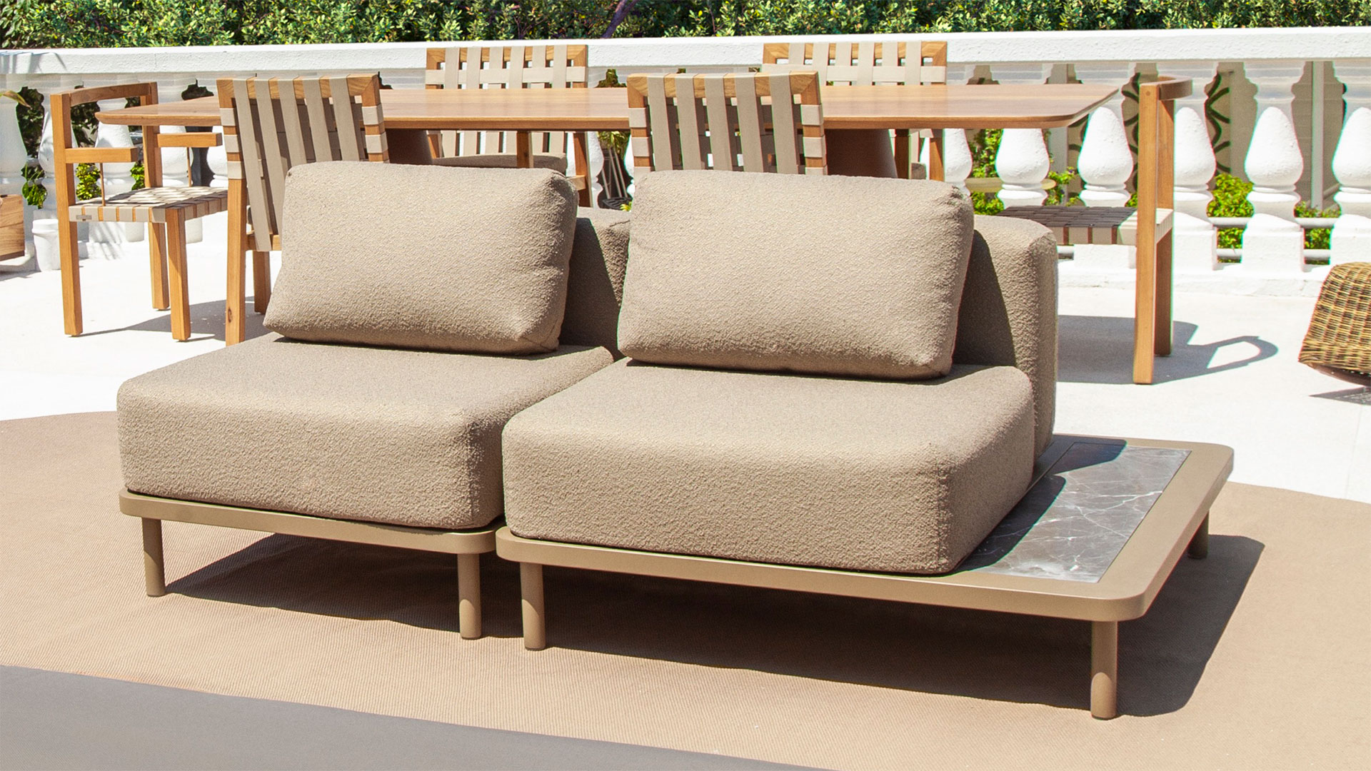 O desenho limpo, com proporções baixas e plataforma extensível, valoriza a convivência descontraída e modular. Detalhes como a mesinha lateral embutida em pedra natural criam contrastes elegantes e ampliam as possibilidades de uso.