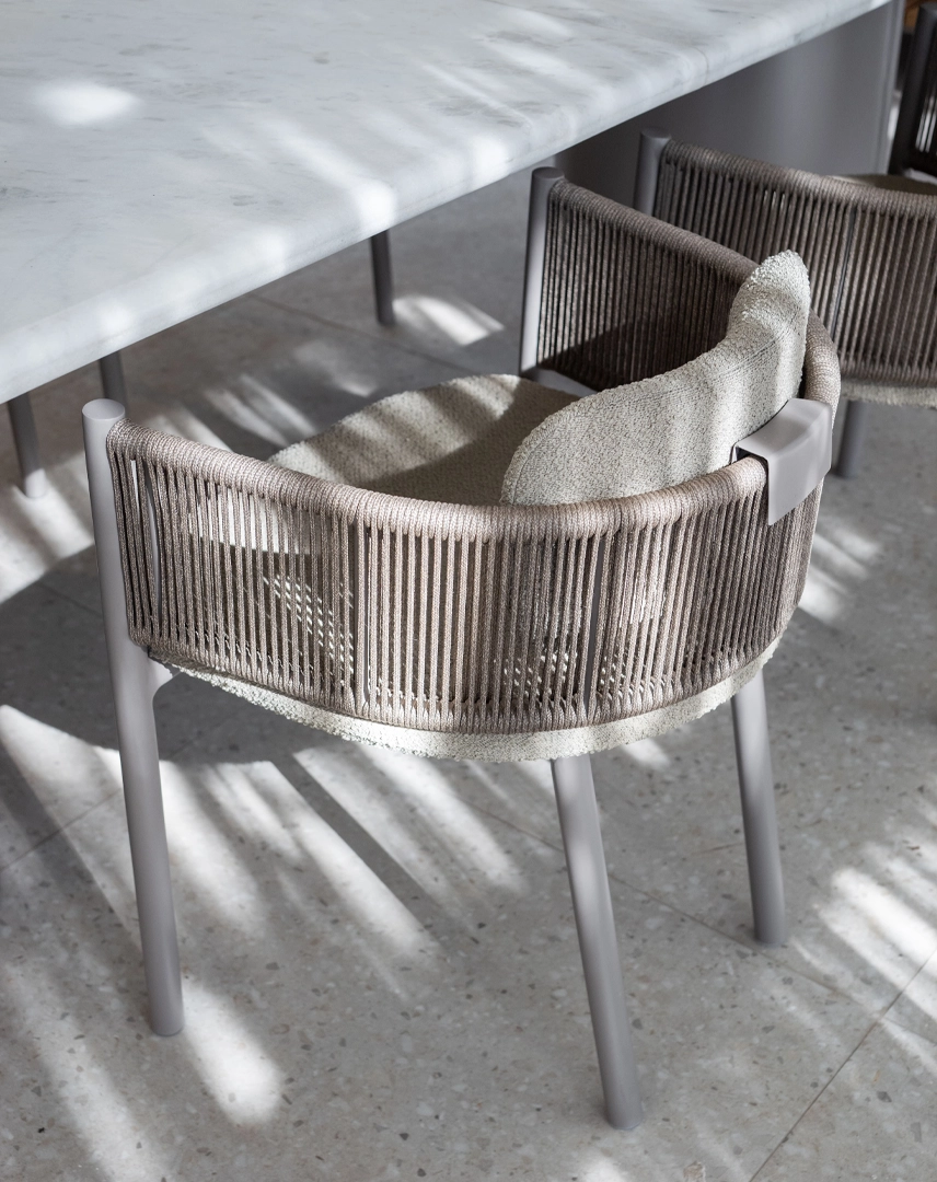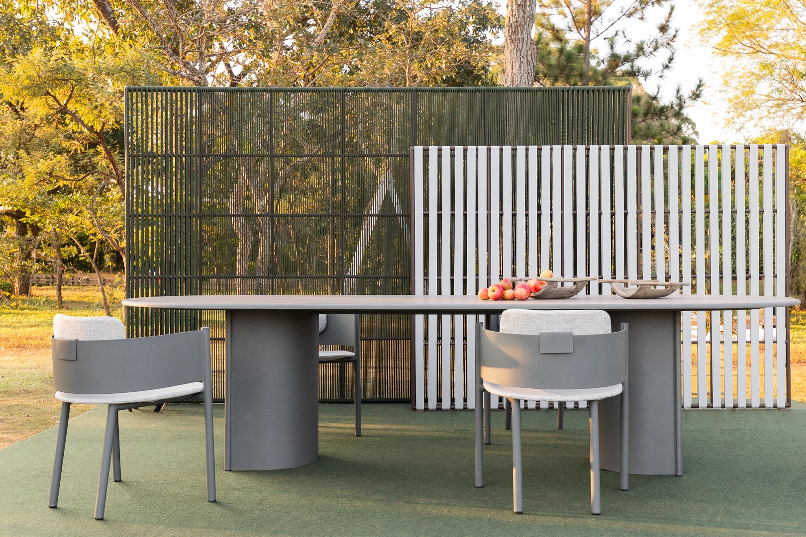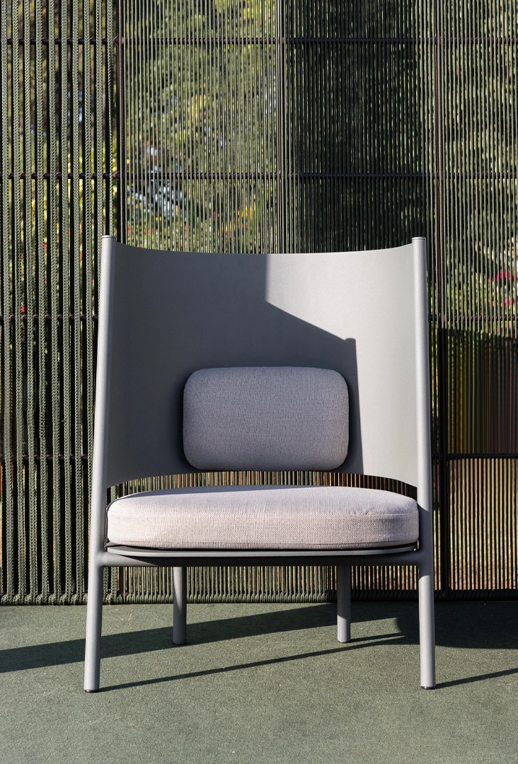 As linhas essenciais da coleção Faixa são exaltadas pelo alumínio e caracterizadas por suas faixas que encontramos nos encostos das cadeiras, poltronas, sofá e nas bases das mesas e mesinhas de centro.