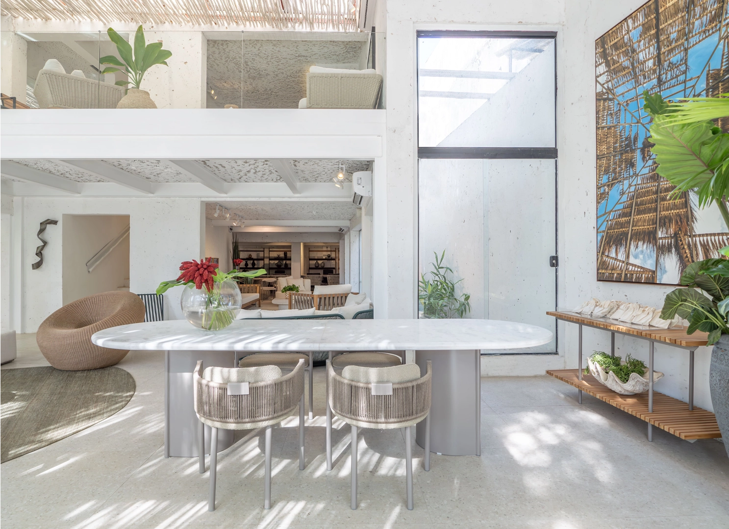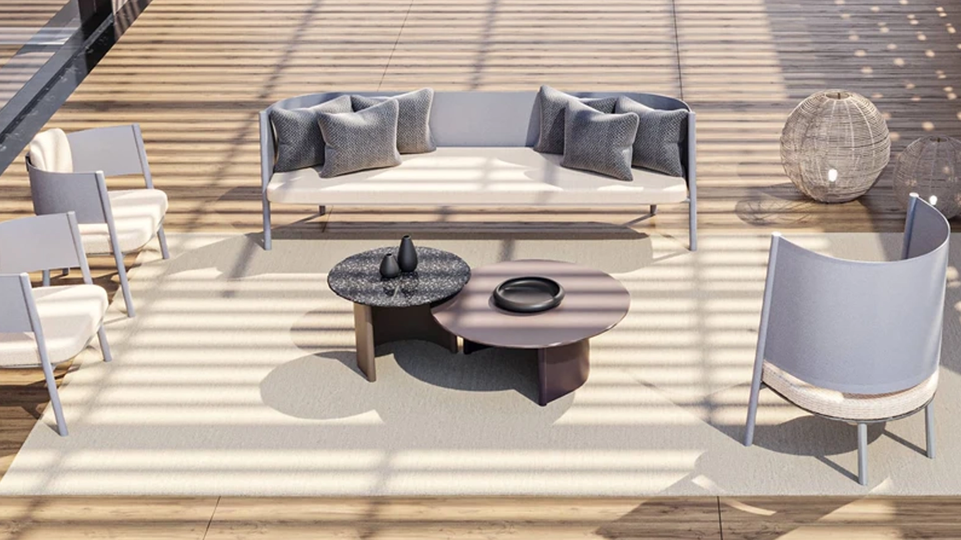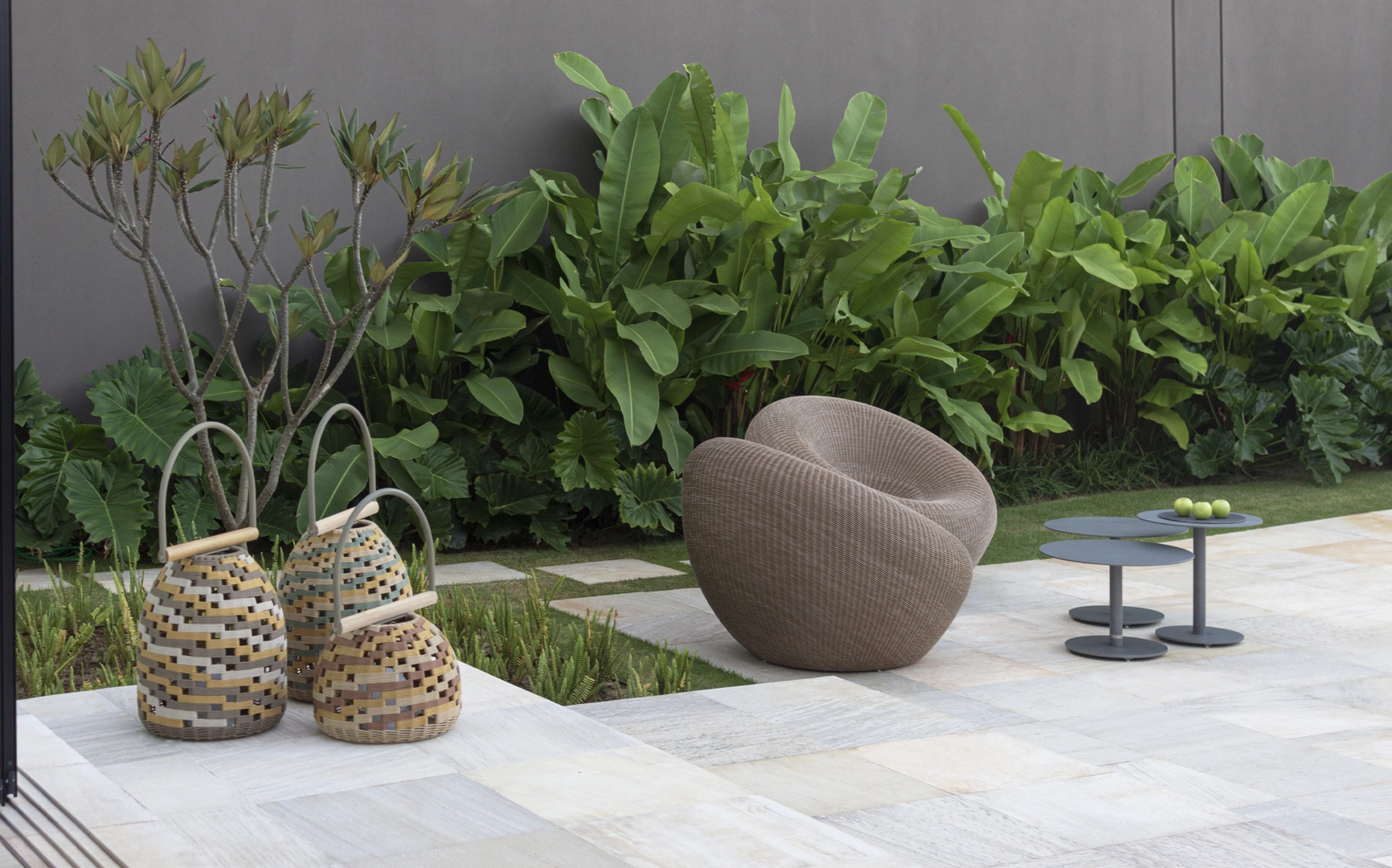 As linhas essenciais da coleção Faixa são exaltadas pelo alumínio e caracterizadas por suas faixas que encontramos nos encostos das cadeiras, poltronas, sofá e nas bases das mesas e mesinhas de centro.