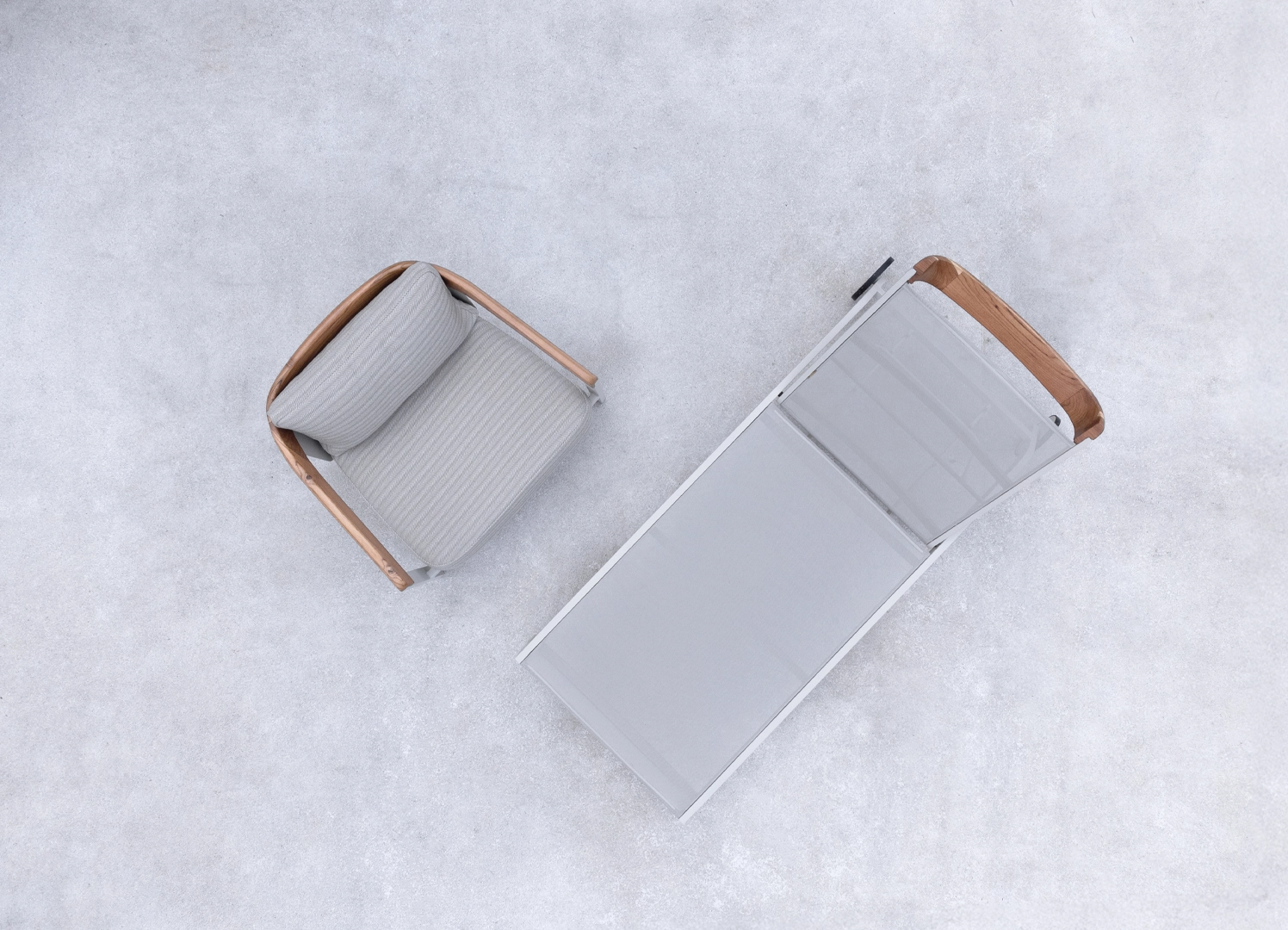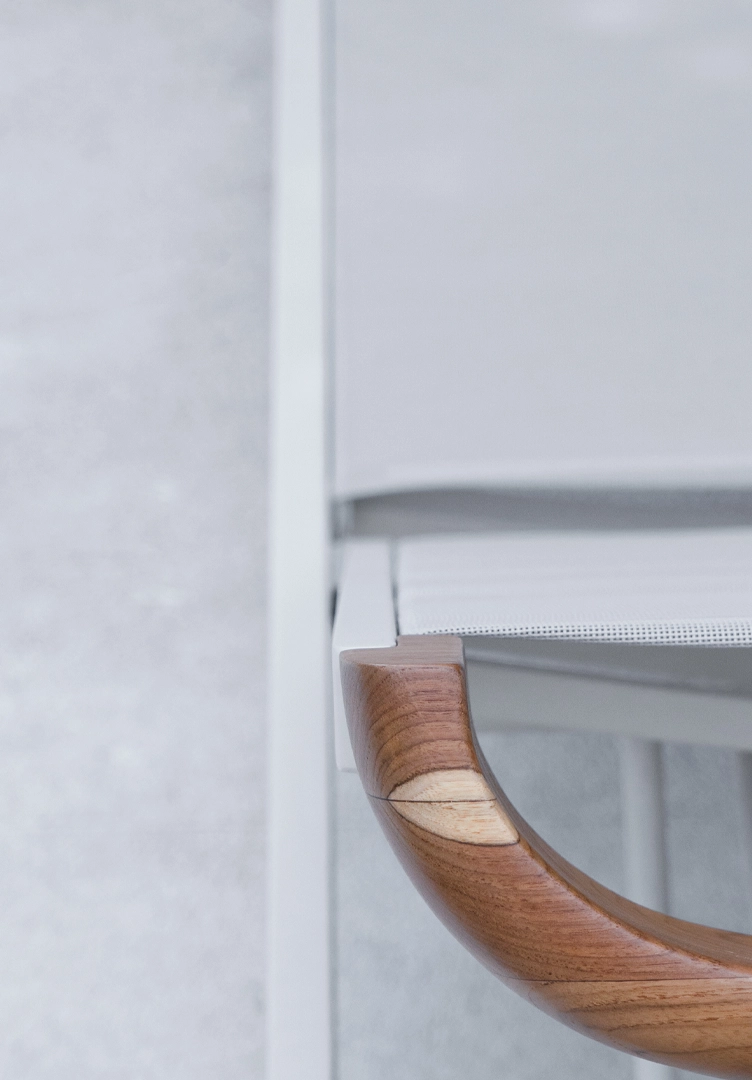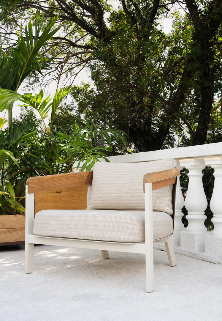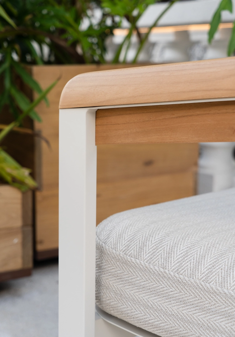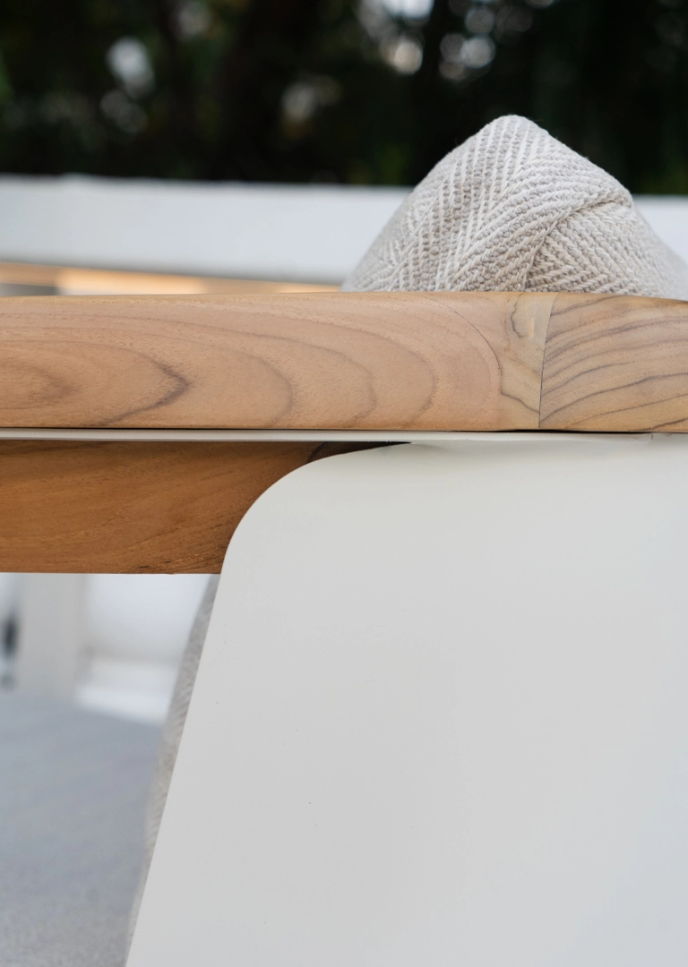 A coleção Legno é a tradução do equilíbrio entre leveza e solidez. Sua estrutura em alumínio oferece uma base resistente e contemporânea, enquanto os braços em madeira natural revelam o toque artesanal que aquece e valoriza cada peça. O estofado convida ao repouso, acolhendo o corpo com suavidade.