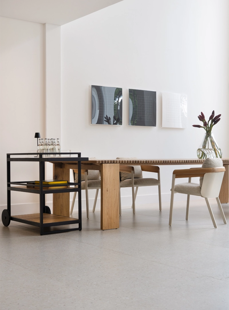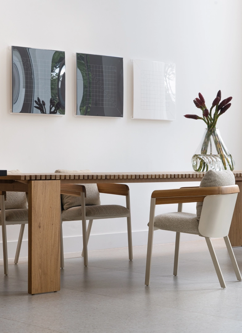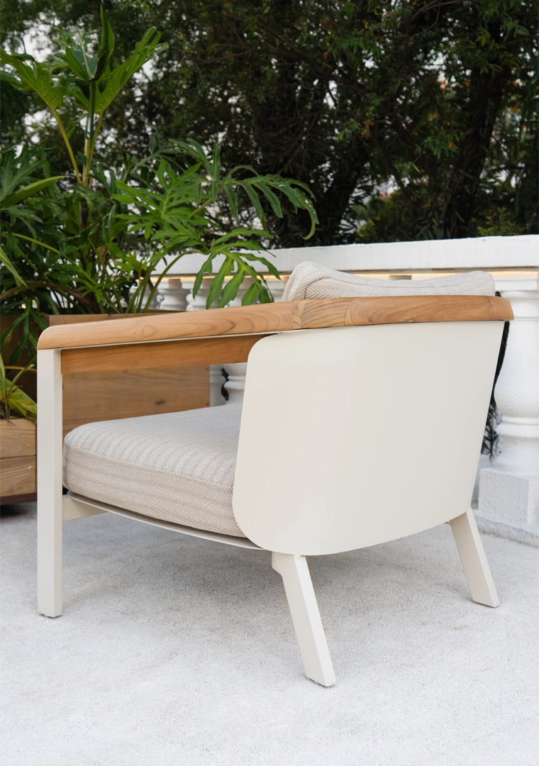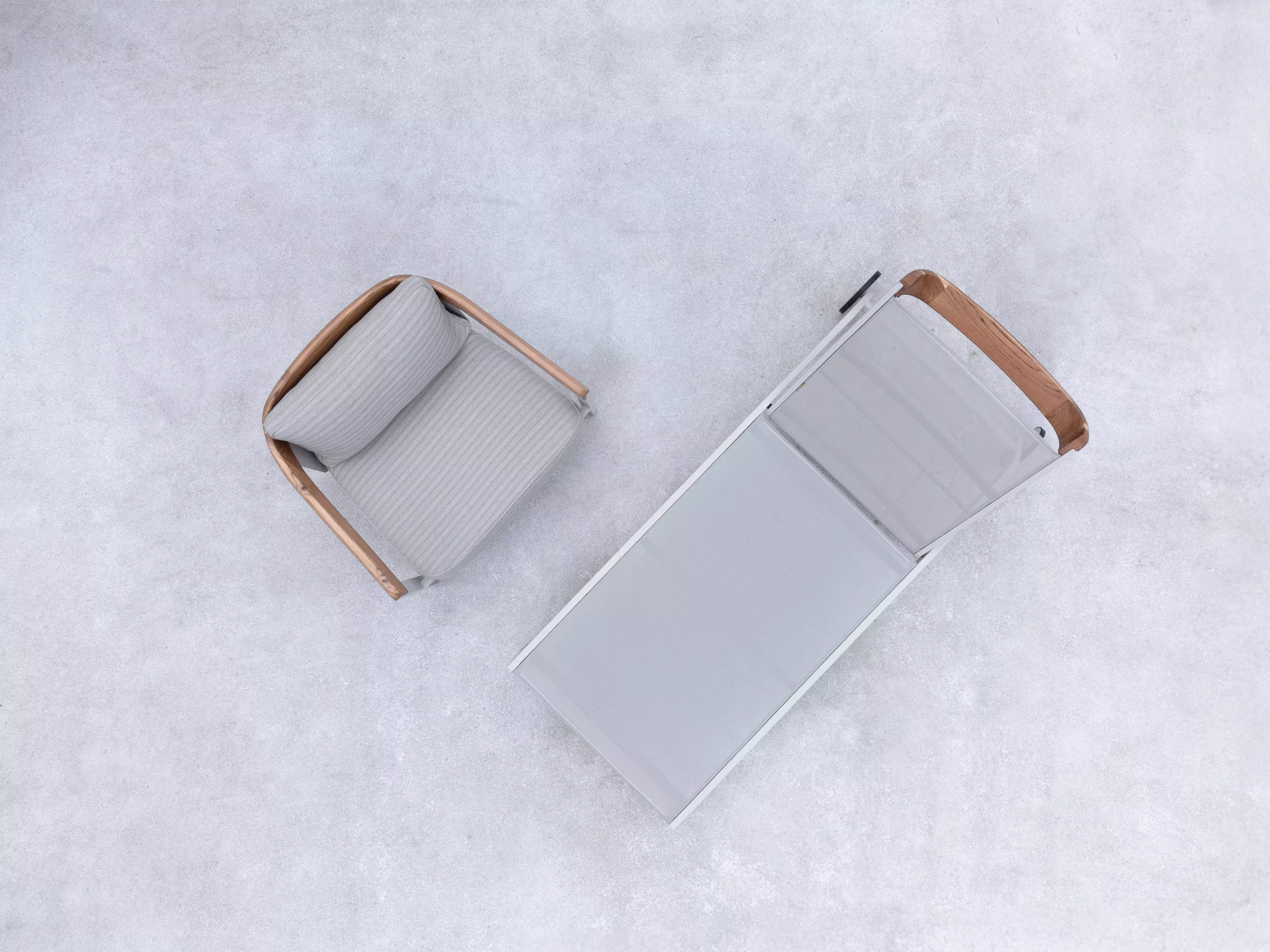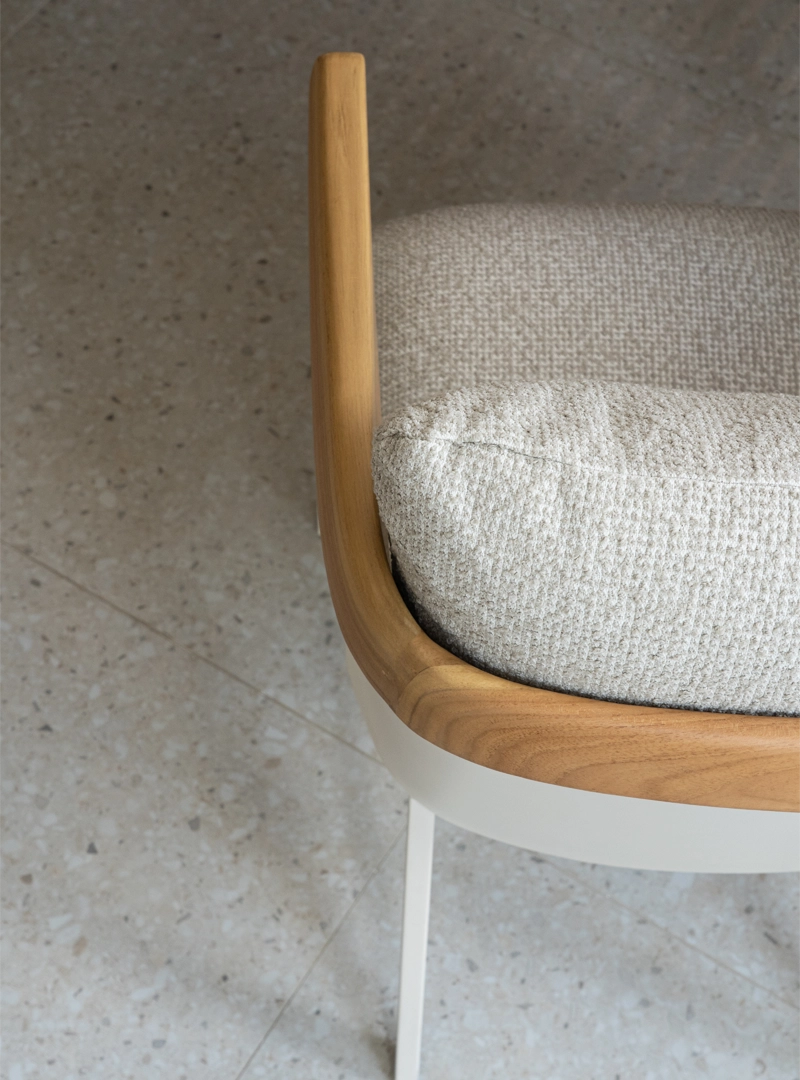 A coleção Legno é a tradução do equilíbrio entre leveza e solidez. Sua estrutura em alumínio oferece uma base resistente e contemporânea, enquanto os braços em madeira natural revelam o toque artesanal que aquece e valoriza cada peça. O estofado convida ao repouso, acolhendo o corpo com suavidade.