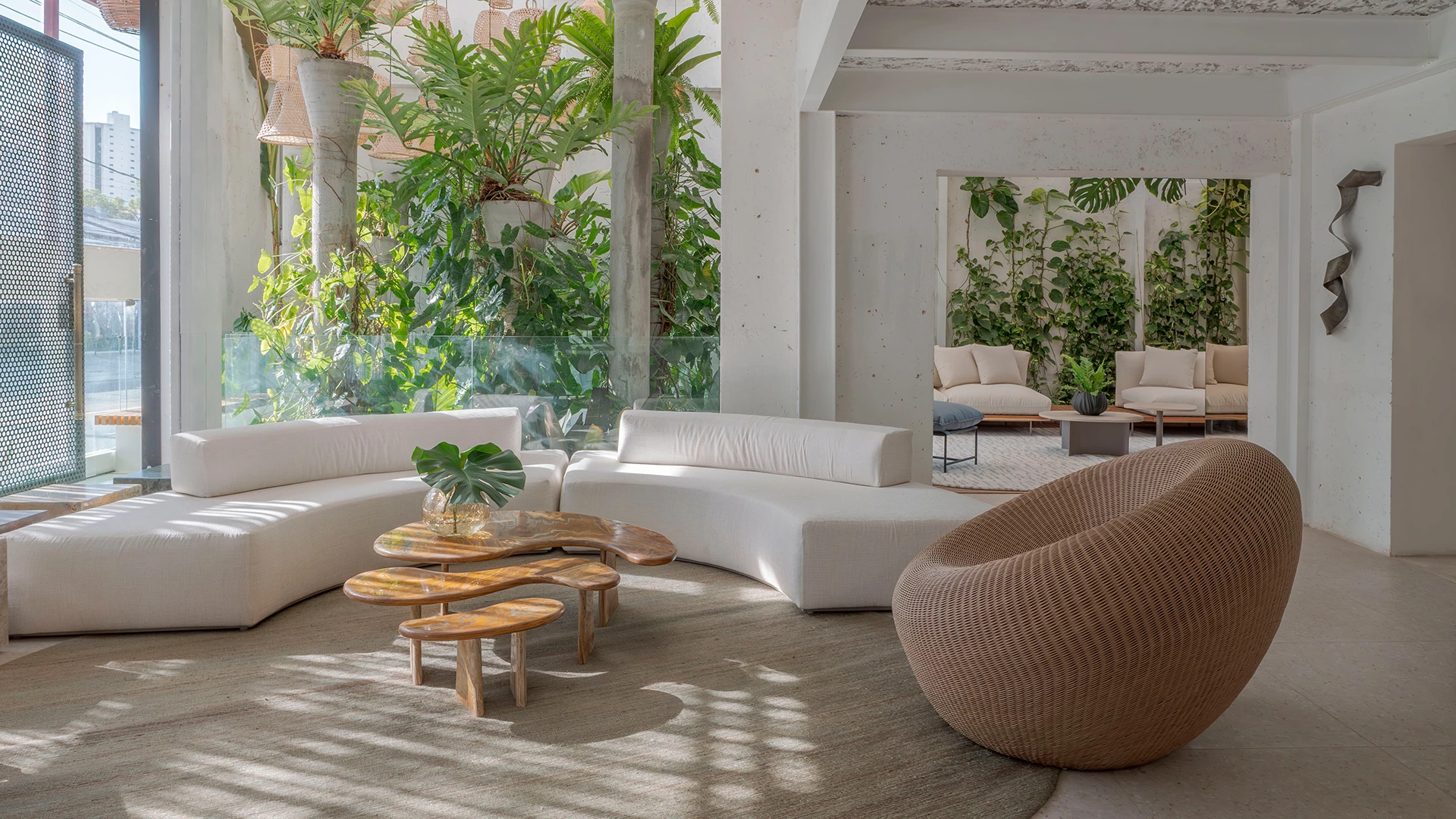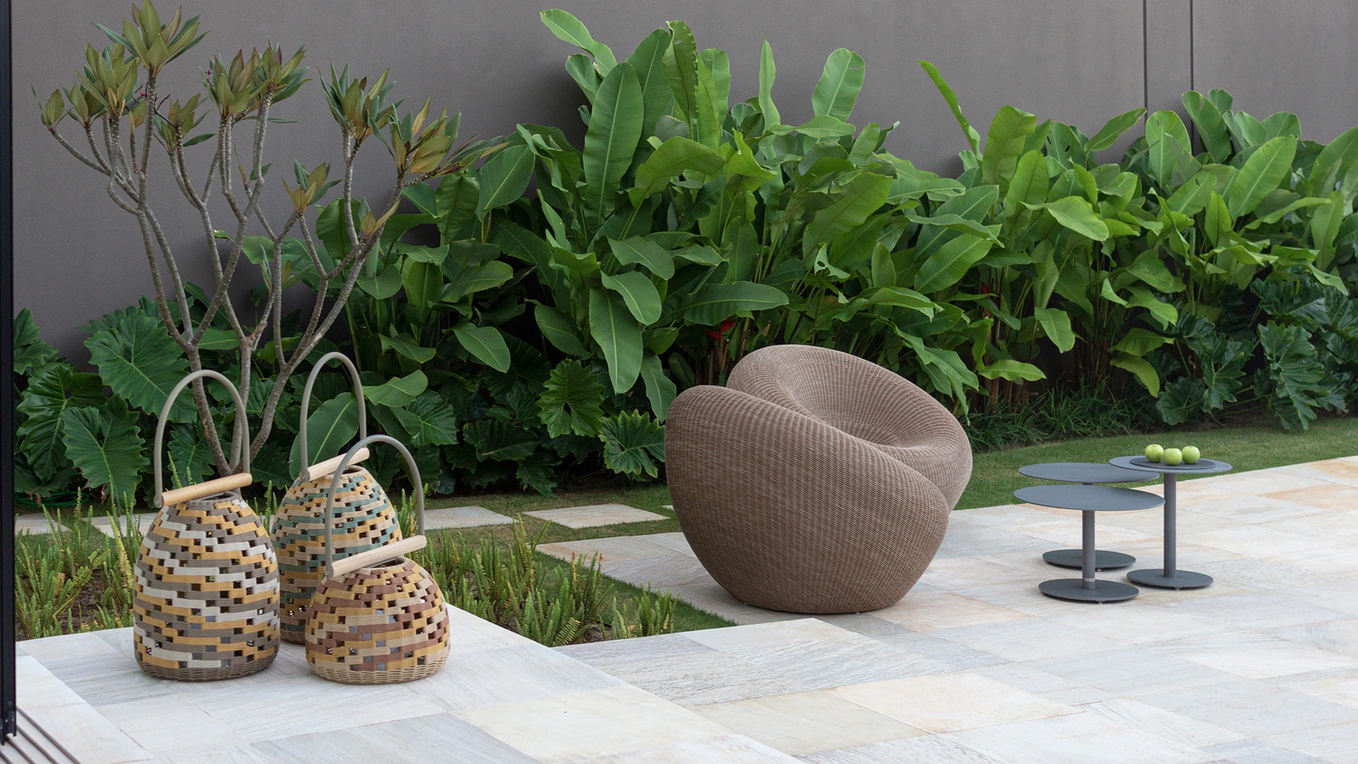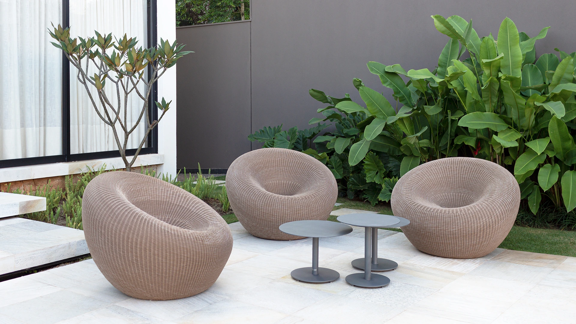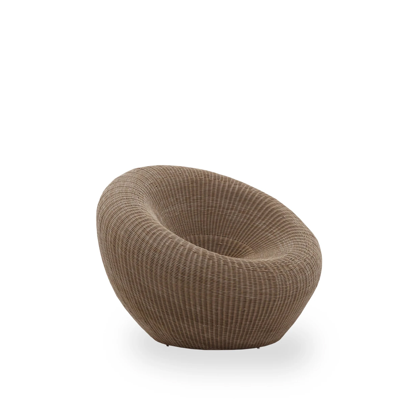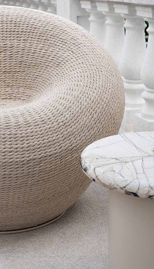 Com linhas orgânicas e formas que evocam acolhimento, foi concebida para envolver quem se senta. Sua estrutura em alumínio confere leveza e durabilidade, enquanto a trama em corda ou fibra cria uma superfície delicada ao toque. O design arredondado e contínuo transmite uma sensação de ninho, um refúgio pessoal para relaxar, ler ou contemplar. O detalhe opcional giratório amplia a versatilidade, permitindo que o usuário acompanhe a conversa ou a vista ao redor sem perder o conforto.