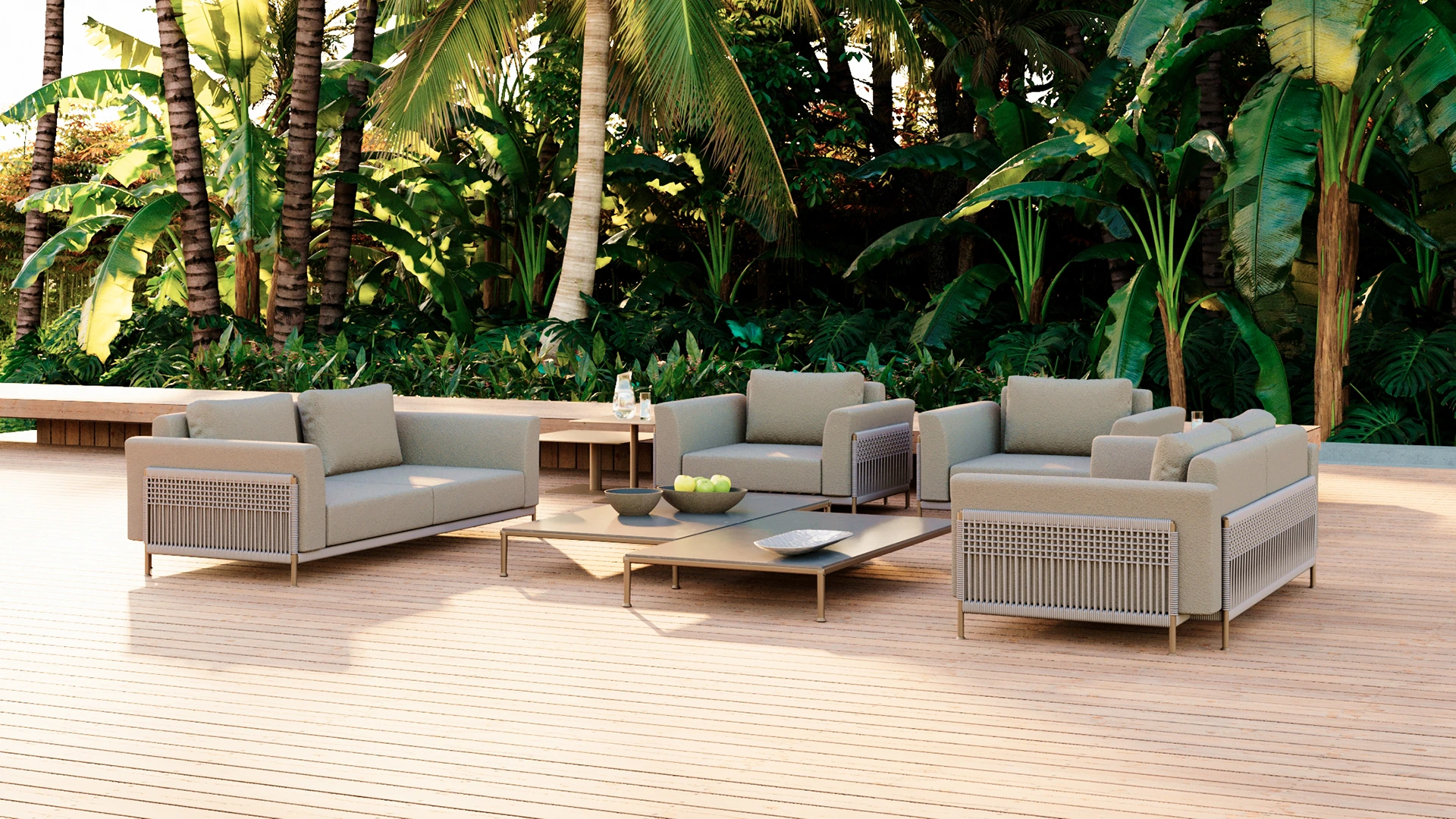 A coleção Plot nasce da união entre design contemporâneo e materiais resistentes, criando peças que transcendem o tempo. A estrutura em alumínio garante leveza e durabilidade, enquanto os detalhes em corda náutica evocam a delicadeza do feito à mão. A tapeçaria completa o conjunto com conforto e estética refinada.