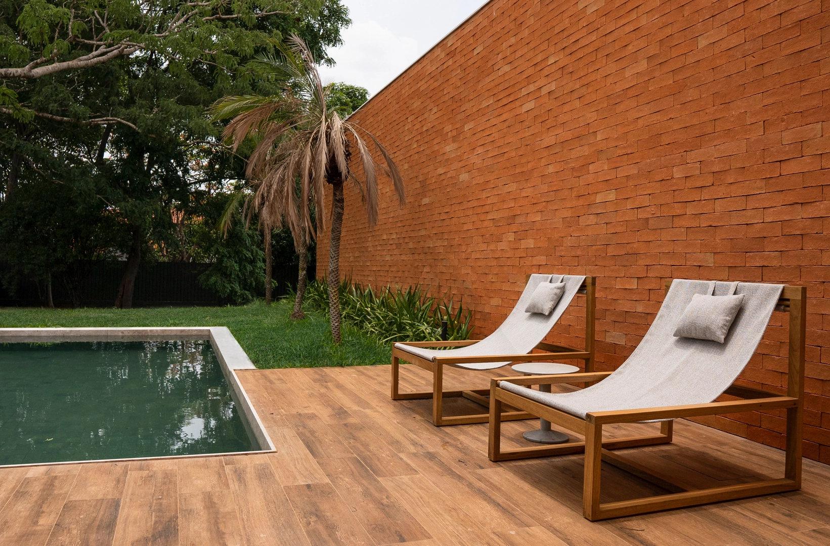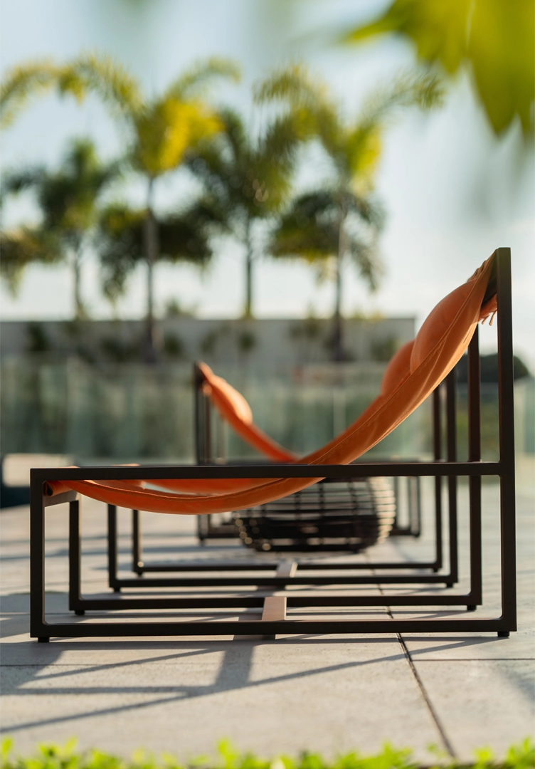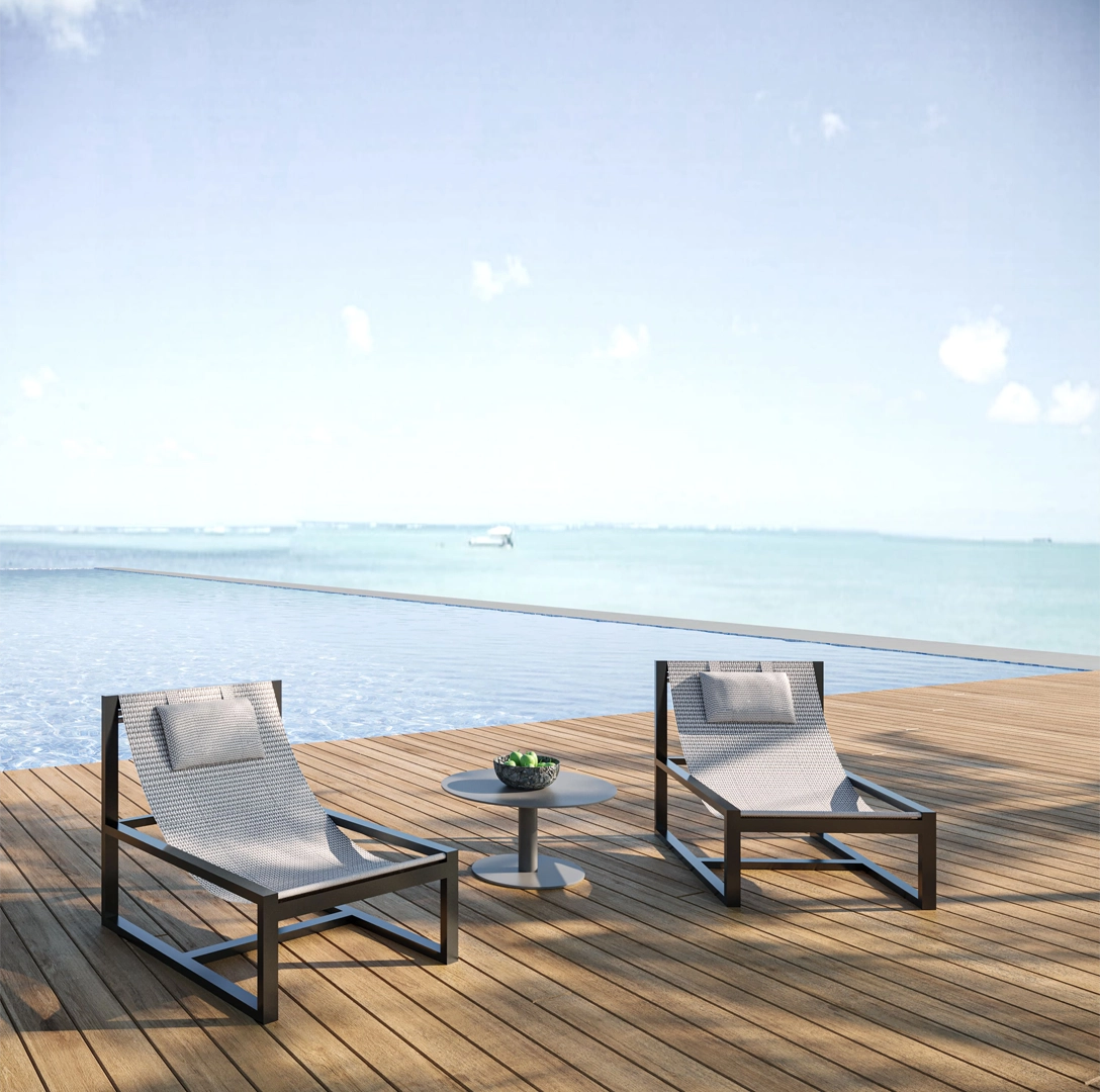 A Sommer tem seu desenho descomplicado e bem resolvido combina linhas geométricas com materiais nobres, como alumínio e madeira natural, criando uma composição moderna e despretensiosa. Com assentos em tela sling ou tecido, a coleção proporciona uma experiência de descanso espontânea, quase flutuante — como se o tempo corresse diferente quando se está nela. A estrutura aberta transmite leveza visual, enquanto a mistura de texturas revela uma elegância silenciosa.