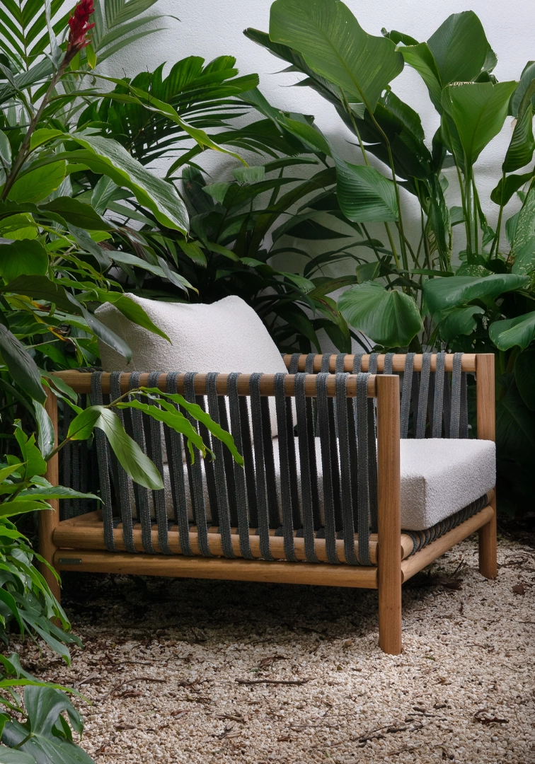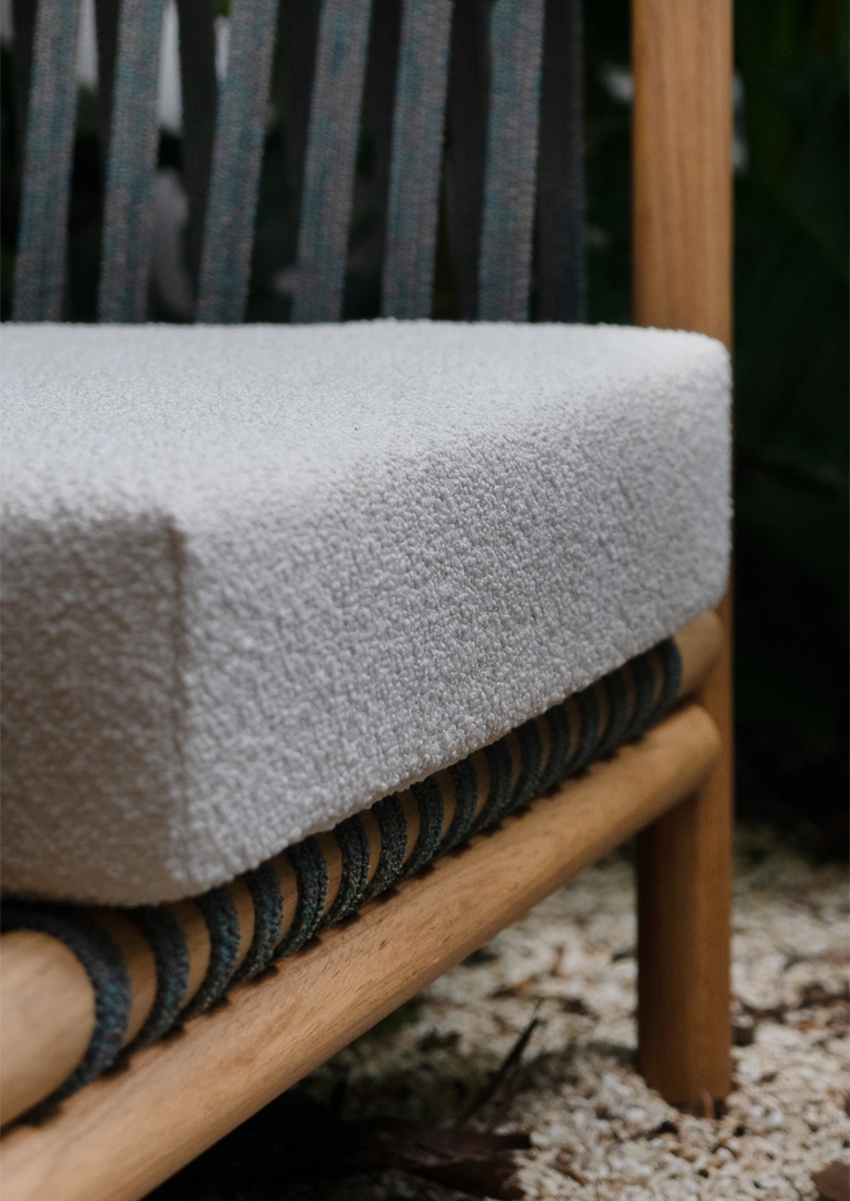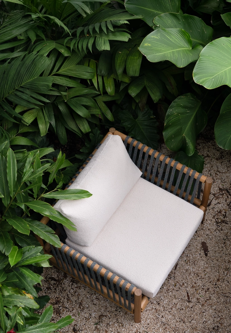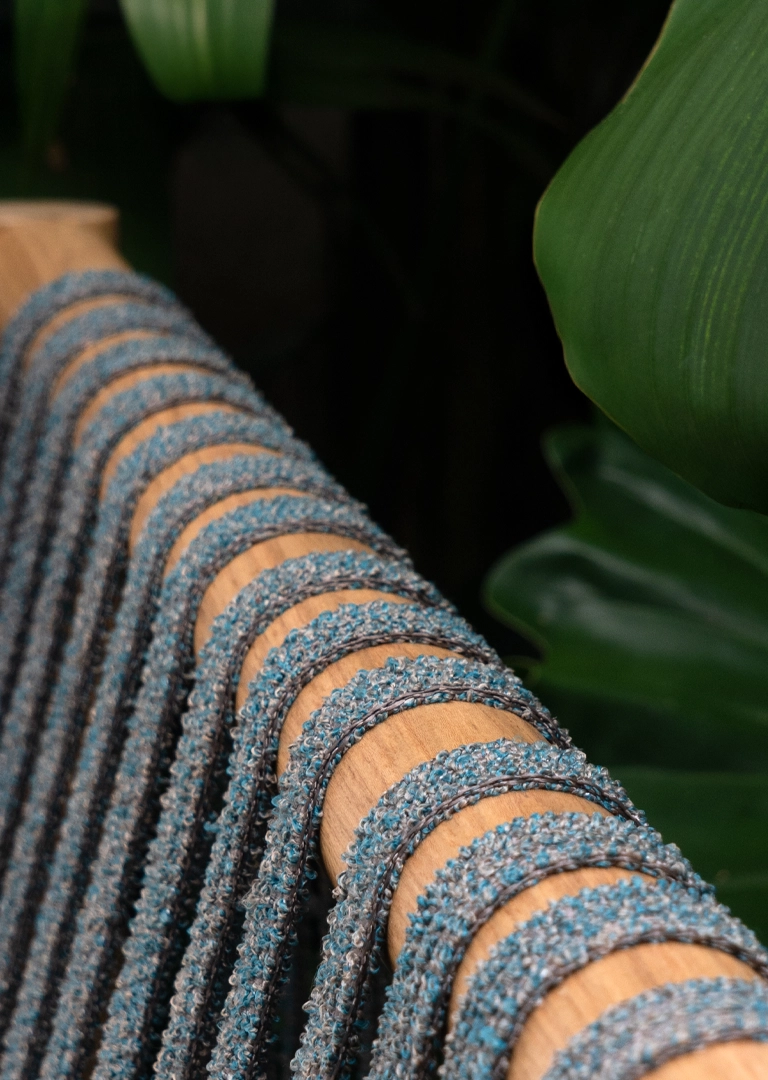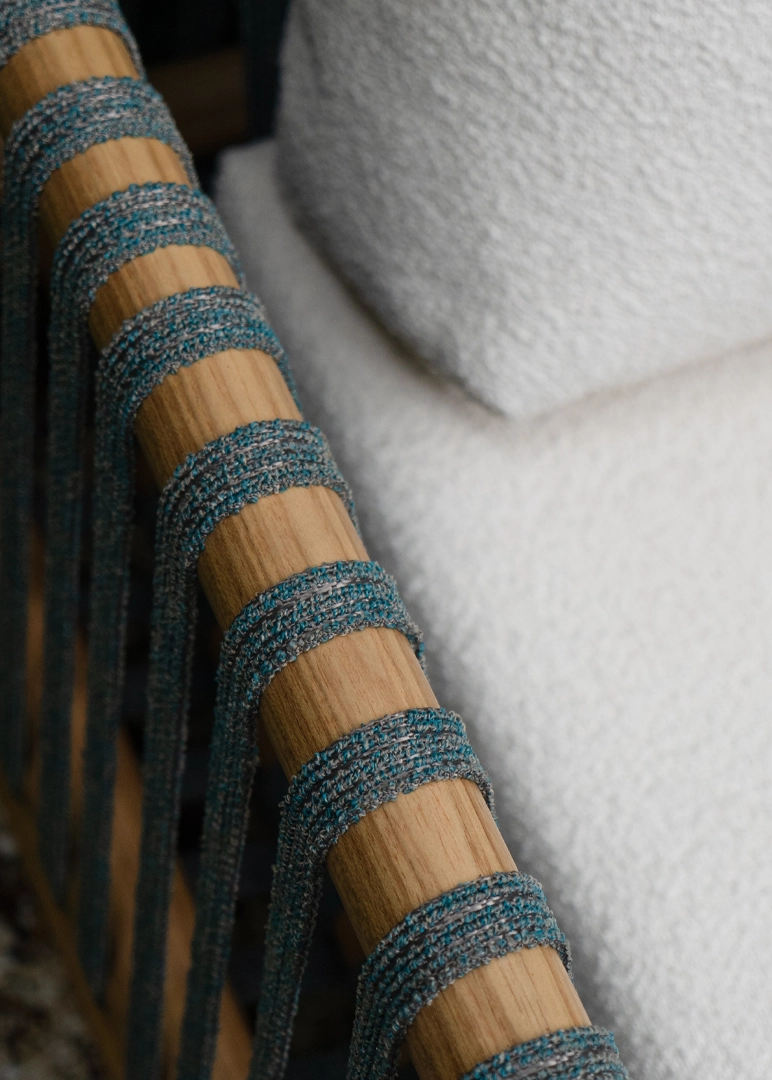 A coleção Truss Circular valoriza a beleza da madeira torneada em perfis circulares, criando uma estrutura que transmite leveza e fluidez. A trama em corda flat boucle contorna o desenho com delicadeza, enquanto a tapeçaria oferece conforto e aconchego. O resultado é uma coleção que traduz o gesto orgânico do design em peças acolhedoras e contemporâneas.