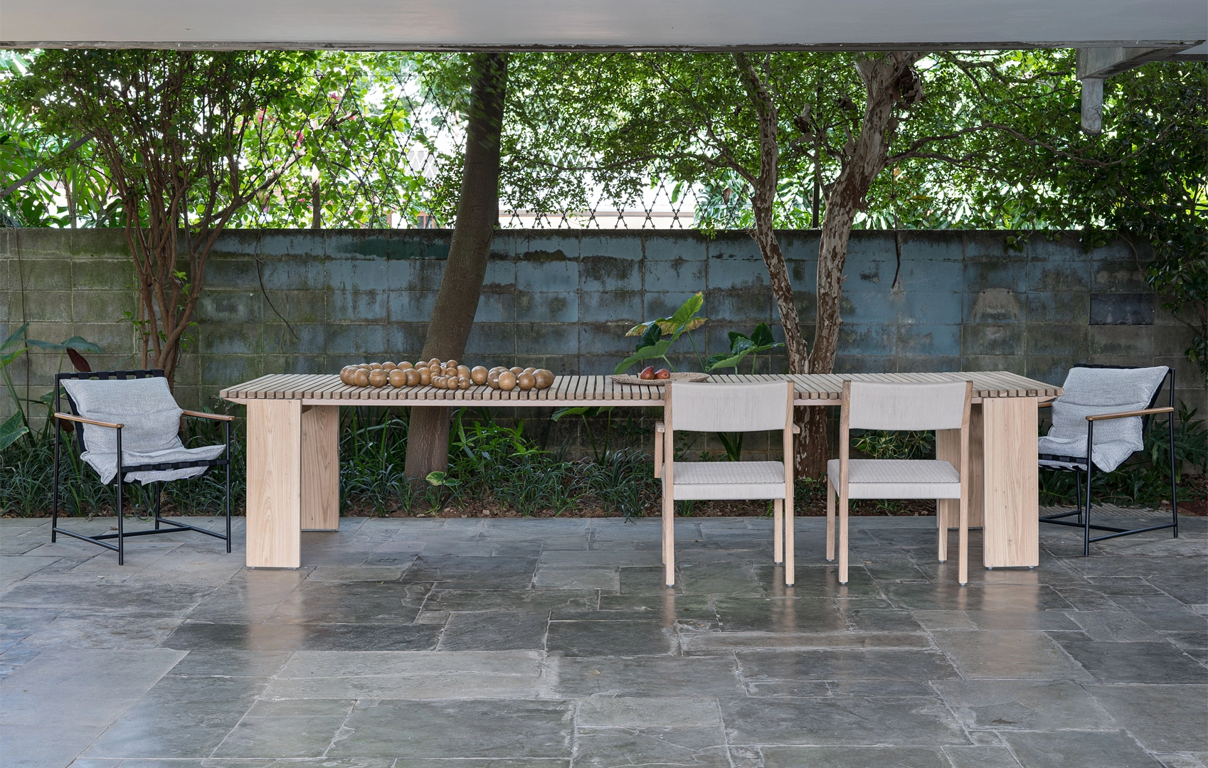 Uma família completa de módulos, elementos finais, permitindo um número infinito de configurações um sistema de sofá de externo inspirado em paletes, mesas de ripas e piso clássico de externo. Projetado para ser extremamente confortável e marcante. Lançamos em 2023 a linha Singapura 2 que remete aos estilo de estofado confort observando a demanda de mercado por um produto cada vez mais confortável