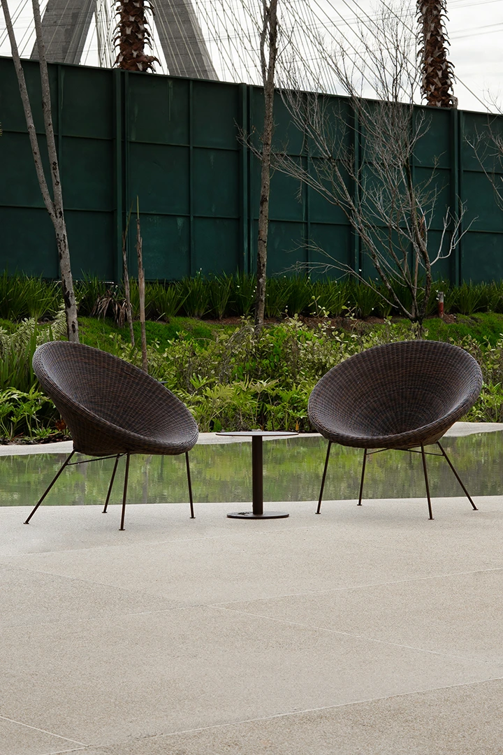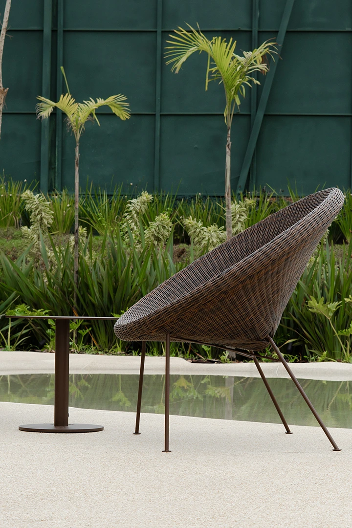 Convida ao relaxamento com um desenho envolvente e orgânico. Seu assento em forma de concha cria uma sensação de acolhimento imediato, enquanto a trama contínua valoriza textura e leveza visual. O design combina curvas generosas e uma base esguia, resultando em uma peça marcante, porém equilibrada.