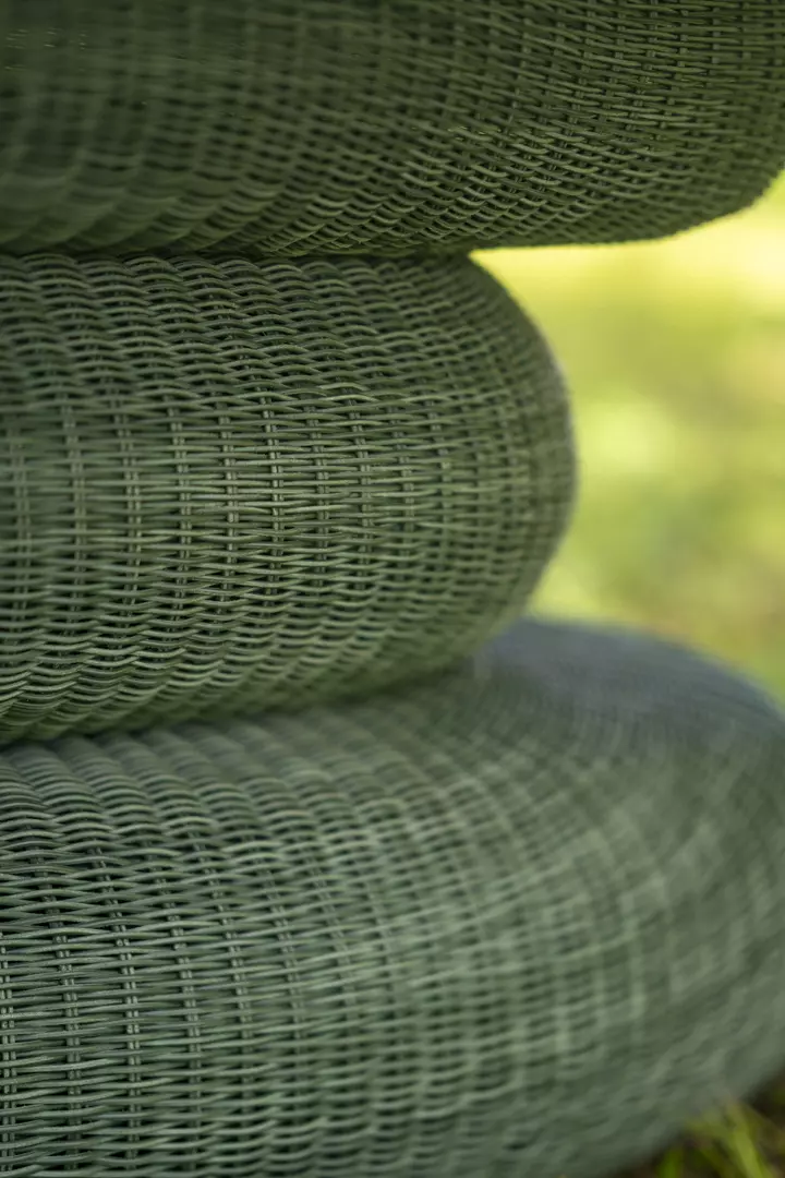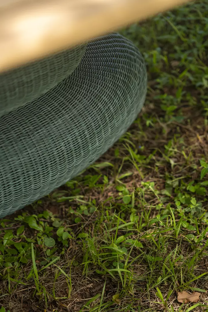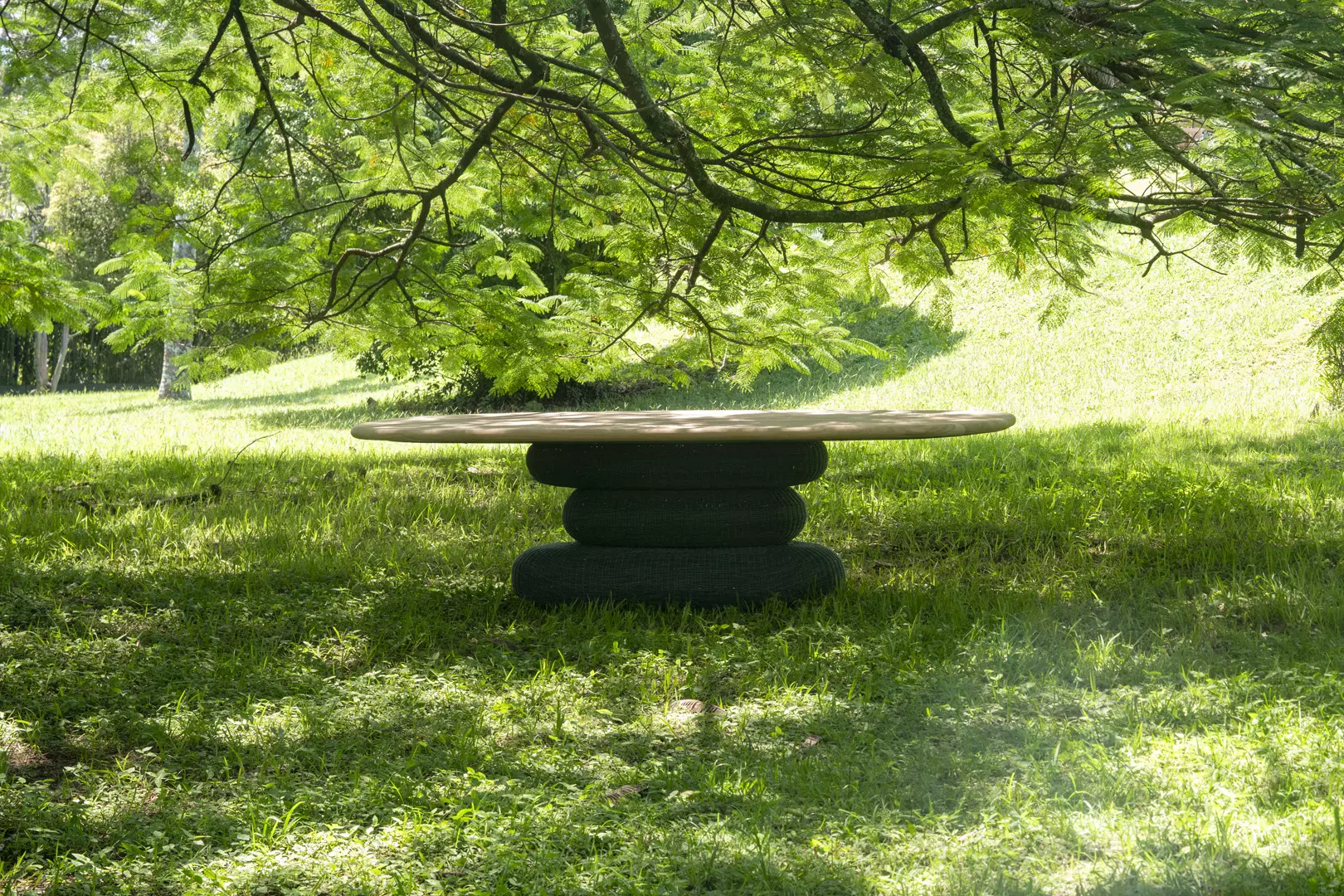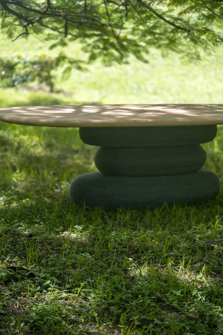 Pedras de rio empilhadas, em equilíbrio silencioso, inspiraram o desenho desta mesa. A base, construída em metal e fibras sintéticas, simula esse gesto delicado de sustentação.