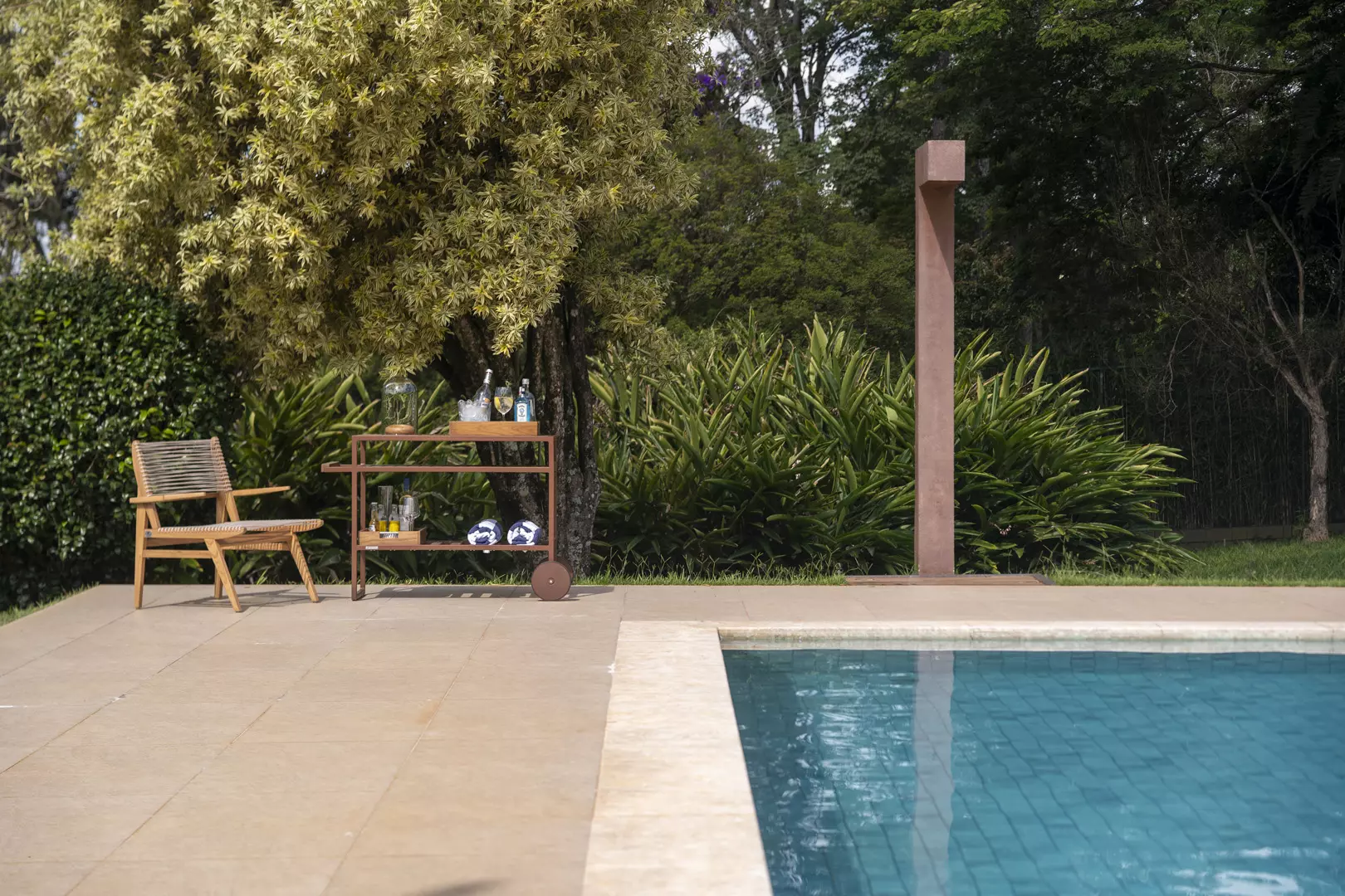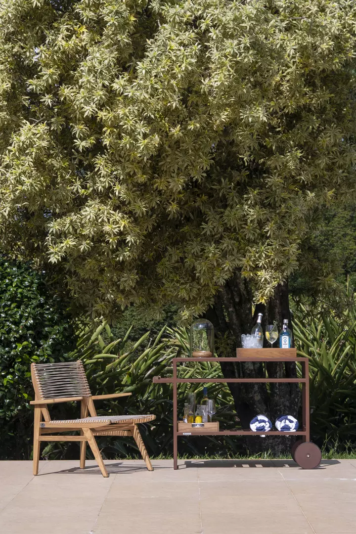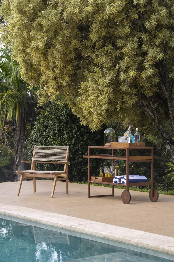 Combina estrutura linear e proporções bem resolvidas, com planos em madeira ripada que trazem textura e ritmo visual. As rodas integradas reforçam a mobilidade, enquanto os compartimentos organizados revelam funcionalidade com sofisticação.