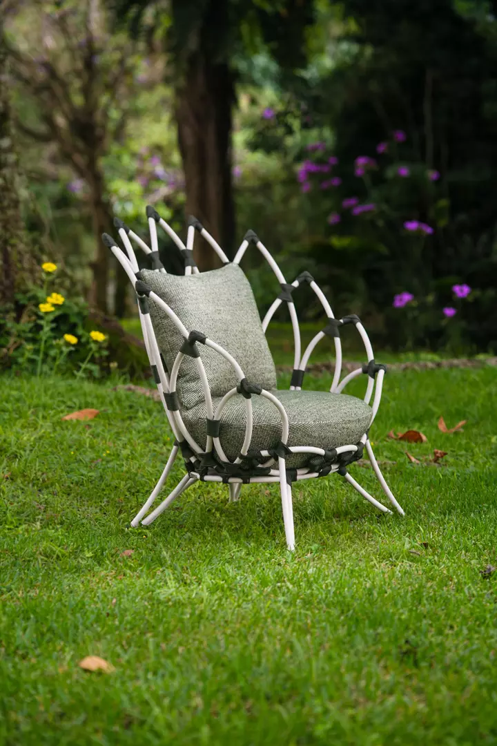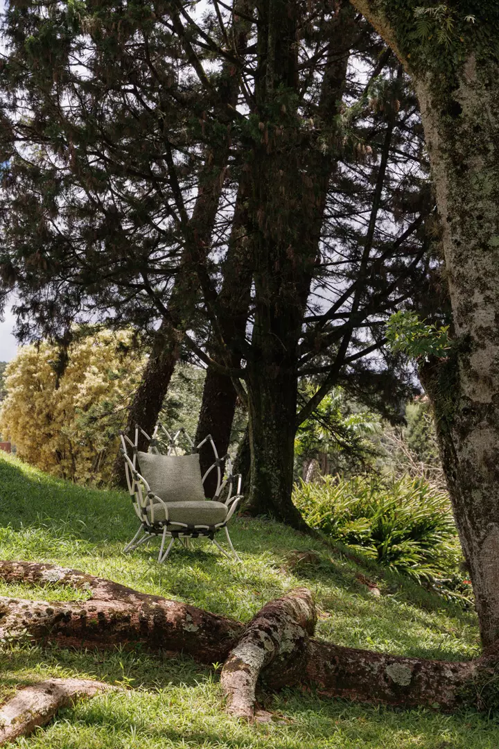Uma peça que abraça, acolhe e se integra à paisagem com naturalidade. Inspirada nas formas da natureza, ela convida ao descanso com leveza, criando um refúgio onde corpo e ambiente se conectam.